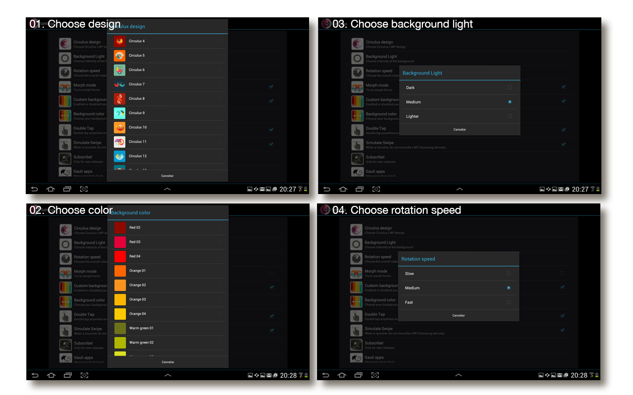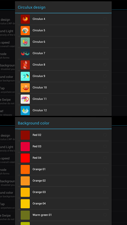 يحتوي البرنامج عل دوائر صغيرة بتصميم الماتيريال ، Circulux LWP هو برنامج بصري يتكون من ألوان و دوائر ، يحتوي على خيارات متعددة ، إمكانية تغيير الألوان و شدة الإضاءة وكل شيء في الخلفية و يمكنك تغييرها في كل مرة . Circulux LWP هو جزء من سلسلة الخلفيات المتحركة بتصاميم الماتيريال ، برنامج ذكي و سهل في نفس الوقت .